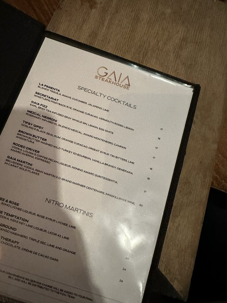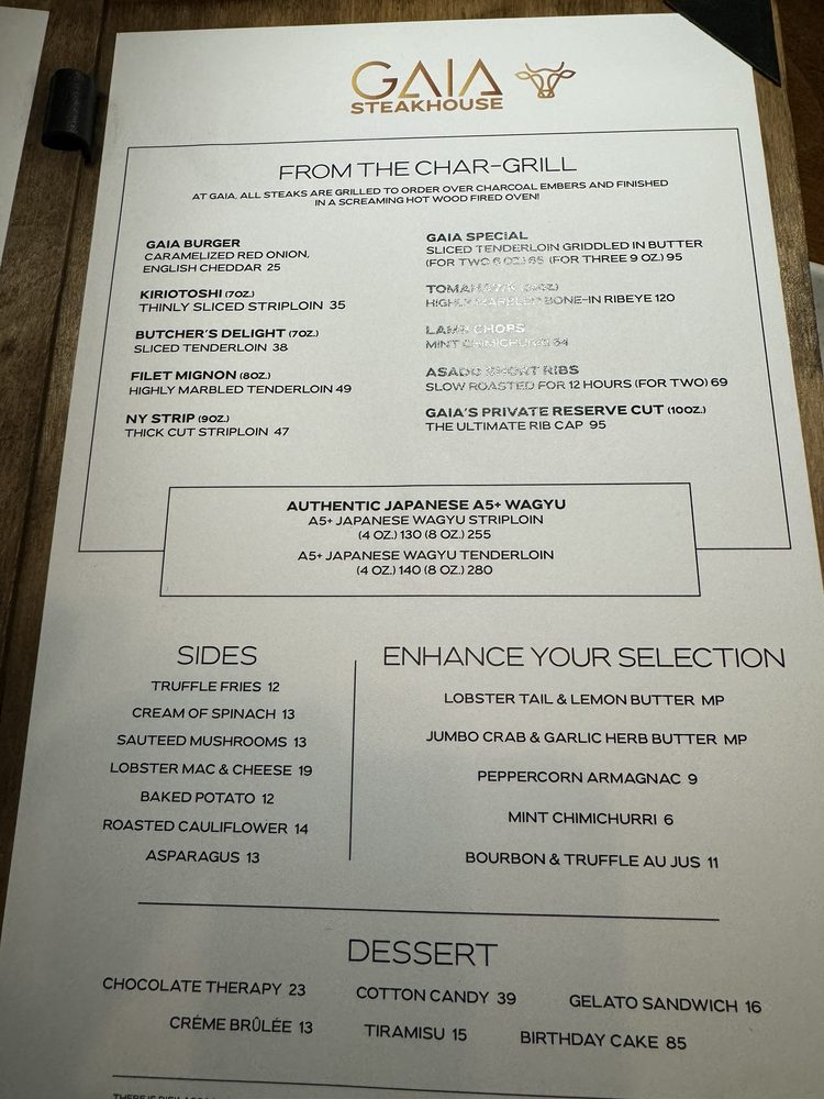 “ I came to Gaia for a birthday dinner with my fiance. I came here because it was supposed to be upbeat eclectic steak house. The place has a beautiful curated ambiance, but the music when we got here was putting me to sleep and had Billie Eilish style of covers of other songs and was not it. The table we sat was in a cute little back room and was very personal but the table legs were a little uncomfortable and the table was a little too far but it had some style with it. The service was great, it was fast, everything was explained and even the awesome cut of our steaks with salt bae action display was super cool. Just remember if you want to take a picture of the steak tartare with the quail egg make sure you let them know because they squashed it and was not able to to do the squashing myself. Which I like to do. As far as the appetizer flavors and display we got the Spanish octopus which was cooked to perfection and tasted amazing with the chimichurri which had a nice little spice kick to it that was perfect. We also had the steak tartare with the quail egg and caviar that was super delicious and citrusy bringing all the flavors together. Our main dish were the private reserve cut and the filet mignon. The private reserve cut was cooked perfect for a medium rare and the filet mignon was slightly overcooked to a medium instead of a medium rare but the quality of meats were great and super tender and delicious. We paired the steaks with Sautéed mushrooms and that was a great pairing. Finally we had the espresso drink, but switched it with a reposado don julio and a bottle of CHATEAUNEUF-DU-PAPE bottle of wine which was delicious. Their pricing was pretty on point for a steak house and they had a very large wine selection which I did appreciate. Finally the dessert was the ice creams. We loved the ice cream flavors which was the mango, pistachio, chocolate and red bean. They had an outside of white chocolate that was quite overpowering and took away from the ice creams. The chocolate paired well with its outside regular chocolate not white chocolate exterior. The mango tasted well with the white chocolate but the pistacho the white chocolate took away from it. The red bean was too light that you can barely taste even with just the ice cream itself. They do not bring or make the reservation any more special for birthdays, which is something I did appreciate from gw fins and other nice restaurants even if they did a free Dessert taster that would be an awesome add. Service fee is included. I will come back but please keep the music nice and vibey, house music, disco, funky, lo-fi but not Billie eilish style. ”